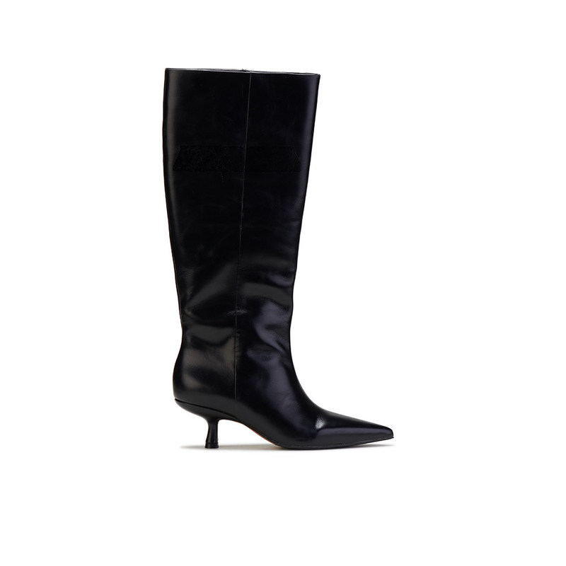黒い皮革 膝の高い尖った足と スティレット ヒール 現代のファッションブーツ